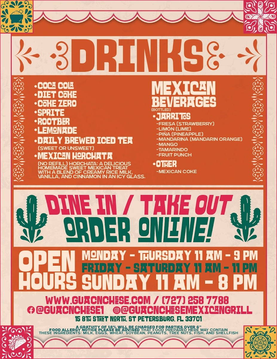 Welcome to Guac n Cheese Mexican Grill, your next favorite dining destination in Tampa! Located conveniently at 4101 S MacDill Ave, this vibrant eatery promises a delightful experience filled with authentic Mexican flavors. The menu is a treasure trove of culinary delights, from thick, rich queso to mouthwatering birria empanadas and perfectly cooked pork enchiladas.